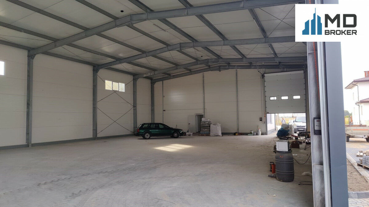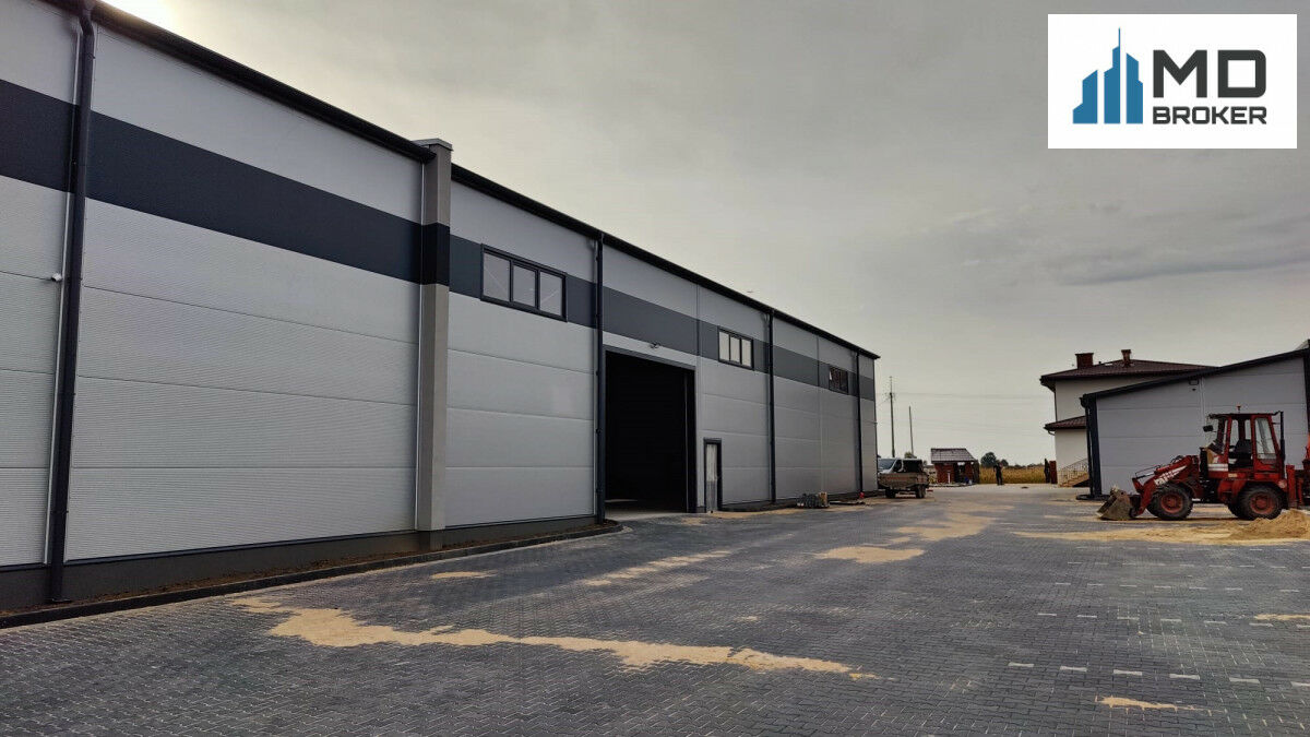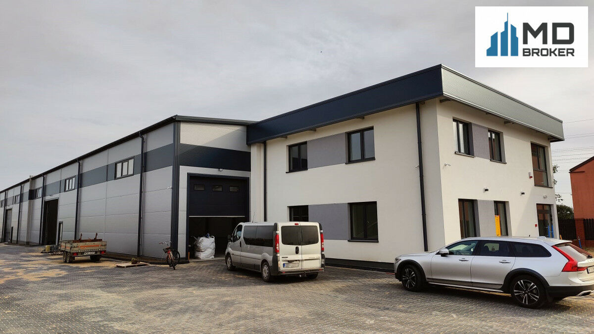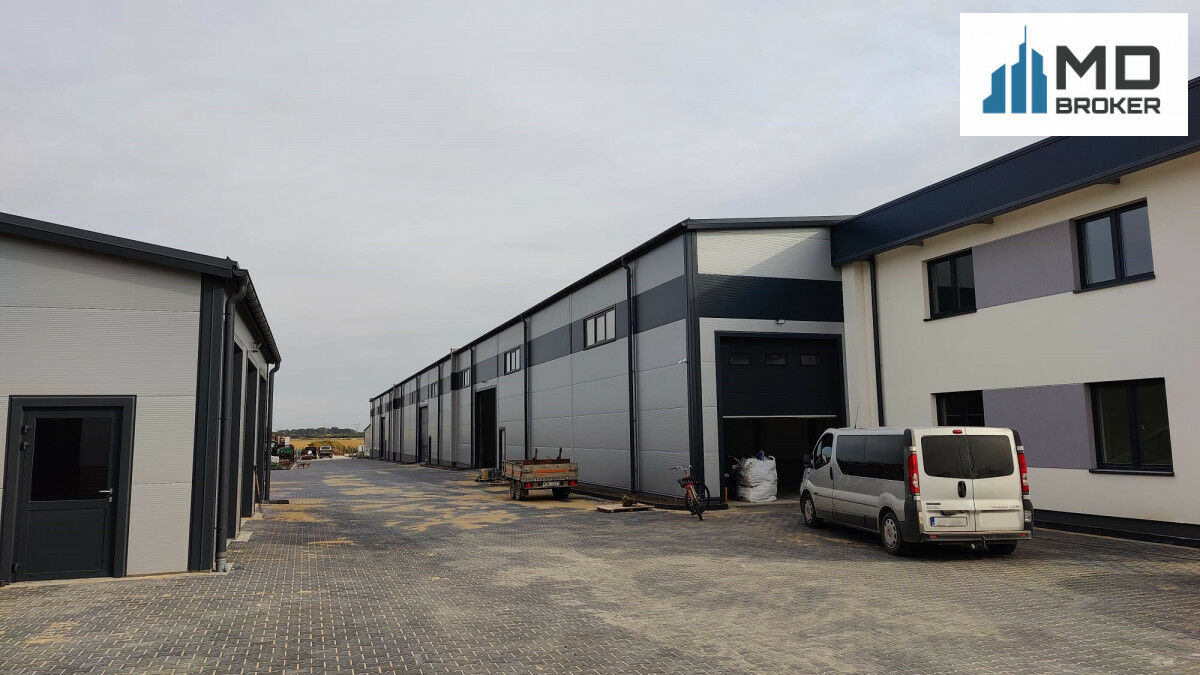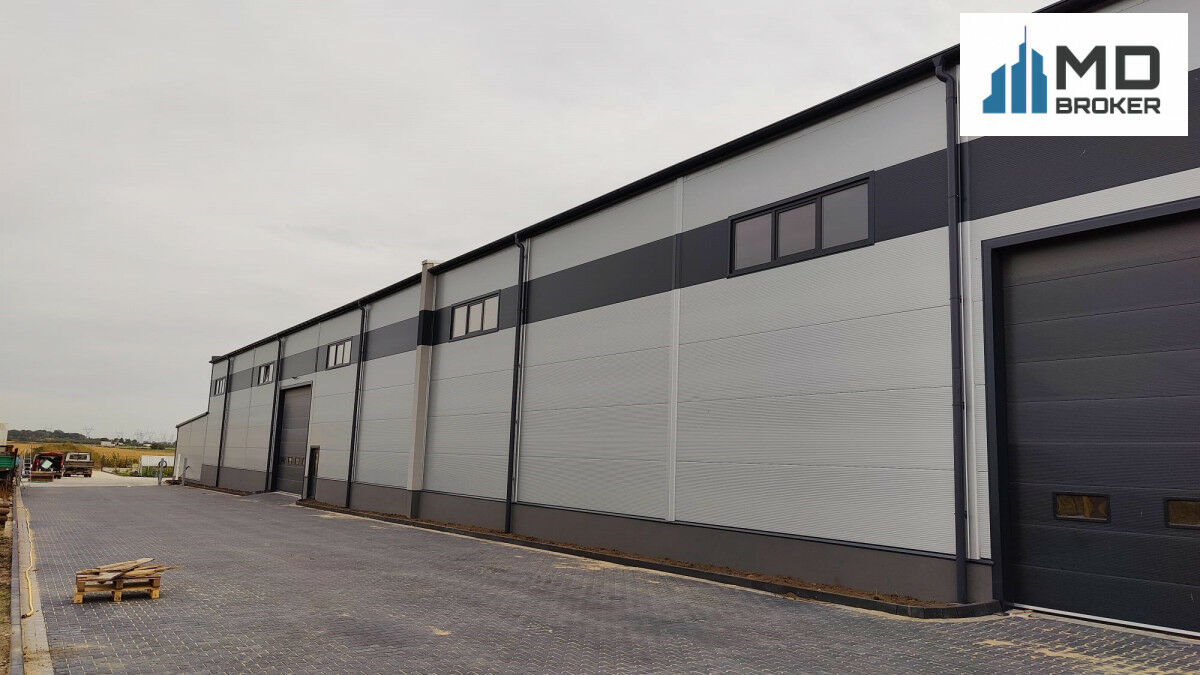 Budynek magazynowy o łącznej powierzchni 1880 m2 (600m2 + 640m2 + 640m2) z wysokością 8,3 m i 4 bramami garażowymi.